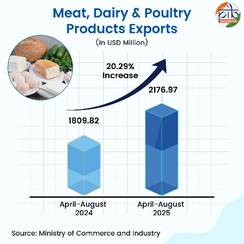 पछिल्लो वर्षको तुलनामा अप्रेल-अगस्त २०२५ मा मासु, डेयरी र पोल्ट्री उत्पादहरूमा २०.२९ प्रतिशतको वृद्धि भएको छ। अगस्त २०२४ को तुलनामा अगस्त २०२५ को अवधि १७.६९ प्रतिशतको वृद्धि दर्ता गरिएको छ। वियतनाम, संयुक्त अरब अमीरात, मिस्र, मलेशिया अनि सऊदी अरब मासु, डेयरी र पोल्ट्री उत्पादहरूको केही आयातकहरू मध्ये हुन्। निर्यातमा वृद्धिका विभिन्न सरकारी पहलहरूद्वारा उत्प्रेरित गरिएको छ। उदाहरणको लागि कृषि निर्यात नीतिले बजार पहुँचलाई अघि बढ़ाउनको लागि एउटा संस्थागत तन्त्र प्रदान गर्दछ अनि कृषकहरूलाई निर्यातको अवसरहरूको लाभ उठाउनको लागि सहायता प्रदान गर्दछ। कृषि अनि प्रसंस्कृत खाद्य निर्यात सम्वर्धन योजना (एपीडा) ले निर्यात आधारभूत ढाँचाको विकास, गुणवत्ता विकास अनि बजार विकासमा व्यवसायीहरूलाई सहायता प्रदान गर्दछ।