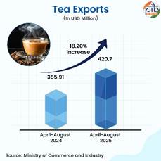चियाले निर्यातमा वृद्धि दर्ता गरेको छ अनि पछिल्लो वर्षको तुलनामा अप्रेल-अगस्त २०२५ मा १८.२० प्रतिशत अधिक भएको छ। चिया निर्यातमा पनि अगस्त २०२४ को तुलनामा अगस्त २०२५ मा २०.५० प्रतिशतको वृद्धि दर्ता गरिएको छ, जसबाट समग्र चिया निर्यात वृद्धिमा तीव्रता आएको छ।