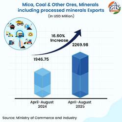 अभ्रक, कोइला अनि अन्य अयस्क, प्रसंस्कृत खनिज निर्यात पछिल्लो वर्षको तुलनामा अप्रेल-अगस्त २०२५ मा १६.६० प्रतिशत बढ़ेको छ। पछिल्लो वर्षको तुलनामा २४.५७ प्रतिशको वृद्धिको साथ अगस्त २०२५ मा पनि वस्तुको बढ़दो मांगको अनुभव गरियो। केही शीर्ष देश जहाँ भारतले प्रससंस्कृत खनिजहरू र त्यसको उप-उत्पादहरूको निर्यात गर्दछ, ती हुन् चीन, अमेरिका, ब्रिटेन, ओमान र बंग्लादेश।