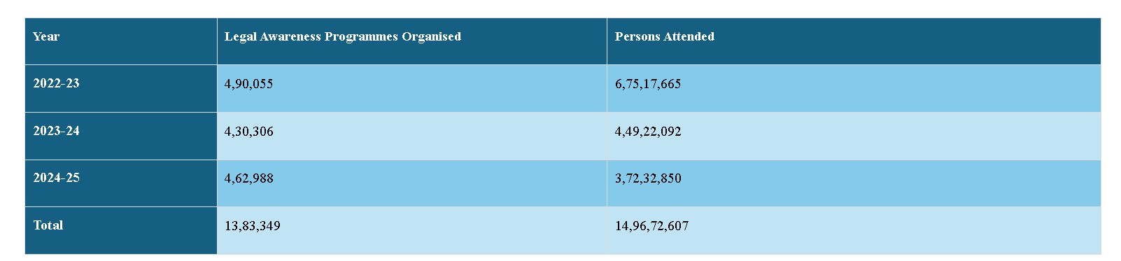২০২৩–২৪ থেকে মে ২০২৪ পর্যন্ত, সারা ভারতে ২,৩১৫-টি প্রশিক্ষণ কর্মসূচি আয়োজিত হয়েছে। আইনি সেবা আইনজীবী ও প্যারা-লিগ্যাল ভলান্টিয়ারদের (PLVs) দক্ষতা বৃদ্ধি করে তারা যাতে প্রান্তিক জনগোষ্ঠীর জন্য কার্যকরভাবে আইনি সহায়তা প্রদান করতে পারেন।
