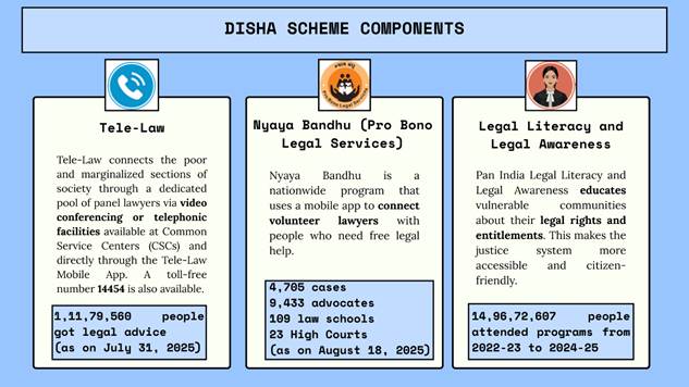 আধুনিক প্রযুক্তি এখন আইনি সেবা সহজলভ্য ও সাশ্রয়ী করে তুলেছে। DISHA (Designing Innovative Solutions for Holistic Access to Justice) প্রকল্পের আওতায় ২.১০ কোটি মানুষ (২৮ ফেব্রুয়ারি ২০২৫ পর্যন্ত) পেয়েছেন বিচারপূর্ব পরামর্শ, প্রো বোনো সেবা, আইনগত প্রতিনিধিত্ব ও সচেতনতা। প্রকল্পটি ২০২১–২০২৬ মেয়াদে বাস্তবায়িত হচ্ছে, যার আর্থিক বরাদ্দ ₹২৫০ কোটি (ভারত সরকারের তহবিল থেকে)।