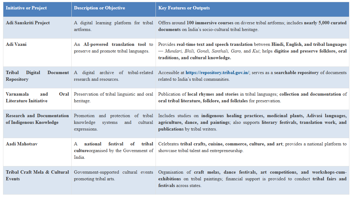 জনজাতি বিষয়ক মন্ত্রক 'আদি সংস্কৃতি' এবং 'আদি বাণী'-র মত অন্যান্য ডিজিটাল উদ্যোগের মাধ্যমে আদিবাসী শিল্পকলা, ভাষা এবং ঐতিহ্যকে তুলে ধরে।