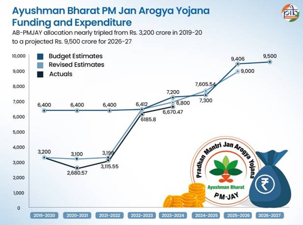 वर्ष 2018 में शुरू की गई आयुष्मान भारत प्रधानमंत्री-जन आरोग्य योजना (एबी-पीएमजेएवाई) के लिए धनराशि में लगातार वृद्धि हो रही है। विश्व की सबसे बड़ी सार्वजनिक स्वास्थ्य योजना के तौर पर यह प्रत्येक पात्र परिवार को प्रति वर्ष 5 लाख रुपये तक का स्वास्थ्य बीमा प्रदान करती है, जिससे 12 करोड़ से अधिक जरूरतमंद परिवारों के लिए गुणवत्तापूर्ण स्वास्थ्य सेवा सस्ती हो जाती है। भारत की बदलती स्वास्थ्य व्यवस्था और मजबूत स्वास्थ्य सेवा अवसंरचना की मांग को देखते हुए, अन्य योजनाओं के लिए धनराशि में भी पिछले एक दशक में वृद्धि हुई है।
