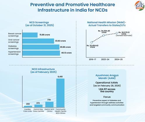 भारत सरकार गैर-संचारी रोगों की रोकथाम और नियंत्रण के लिए राष्ट्रीय कार्यक्रम चलाती है, जिसका मकसद उच्च जोखिम वाले व्यक्तियों की सही ढंग से पहचान करना और उन्हें उचित देखभाल और उपचार से जोड़ना है।