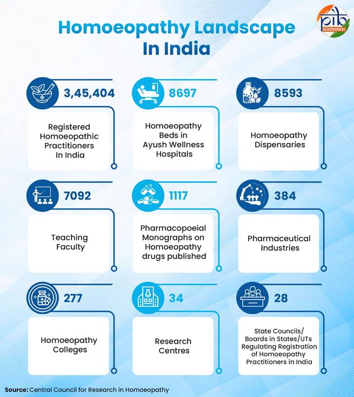 - भारत में 3.45 लाख पंजीकृत होम्योपैथी डॉक्टर, 8590 होम्योपैथी चिकित्सालय, 277 होम्योपैथी शिक्षा संस्थान और 34 होम्योपैथी अनुसंधान केंद्र हैं।