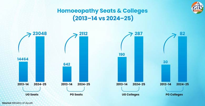 2013–14 से 2024–25 तक होम्योपैथी कॉलेजों और सीटों की संख्या में लगातार हो रही वृद्धि, इन विनियामक सुधारों के प्रभाव और भारत में होम्योपैथिक शिक्षा की बढ़ती क्षमता को दर्शाती है।