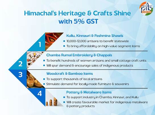 Beyond textiles, Himachal Pradesh is home to a variety of handicrafts and cottage industries, all of which have benefited from GST rationalization. The GST on most handcrafted items was reduced from 12% to 5%; this has direct implications for artisans across the state.