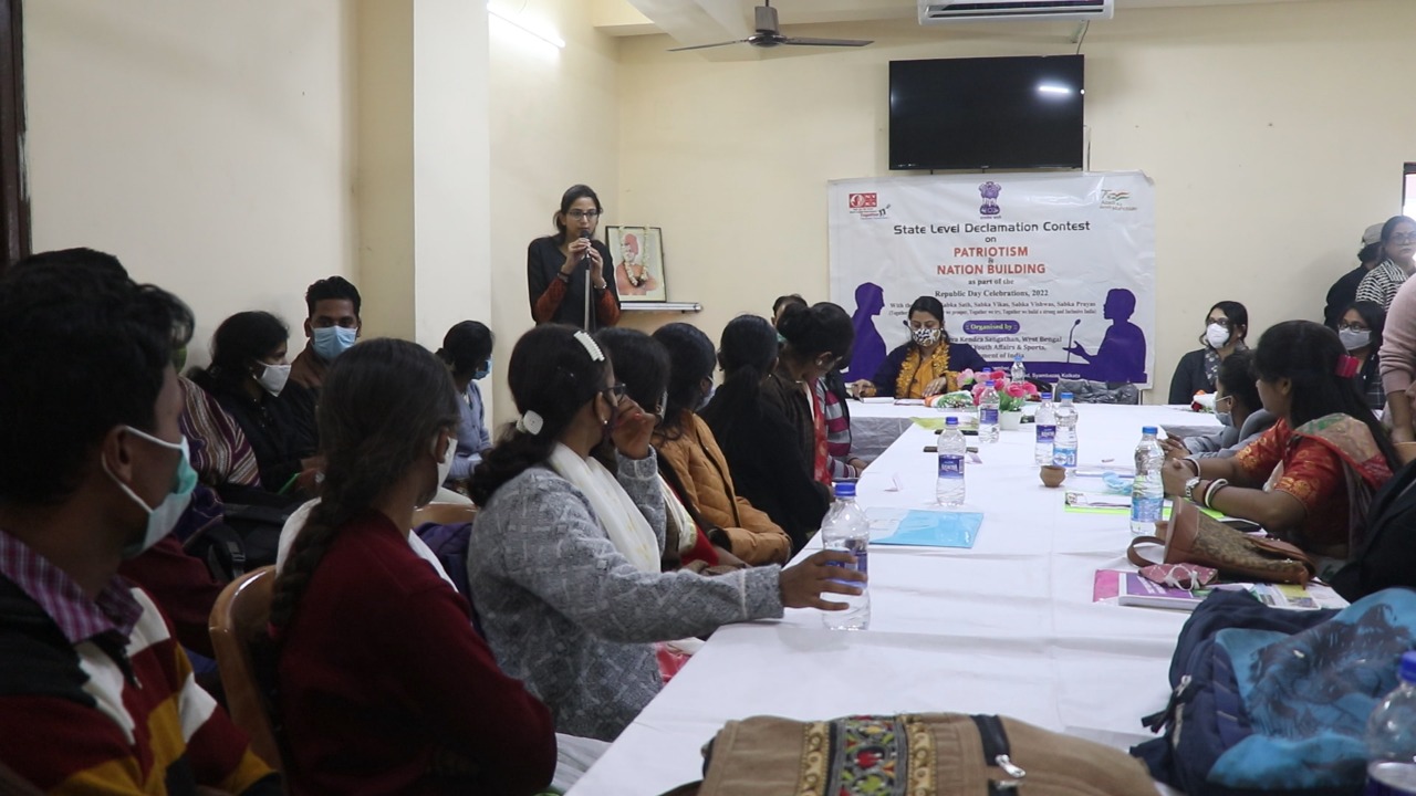 ছবির শিরোনামঃ- নেহরু যুব কেন্দ্র সংগঠনের উদ্যোগে কলকাতায় রাজ্যস্তরে বক্তৃতা প্রতিযোগিতায় অংশগ্রহণকারীরা ‘দেশপ্রেম ও দেশ গড়া’- বিষয়ে বক্তৃতা দিচ্ছেন ।