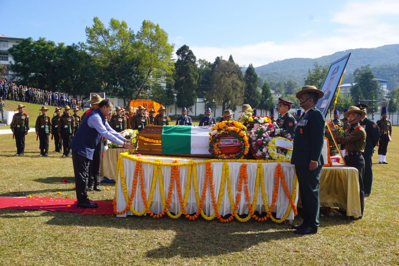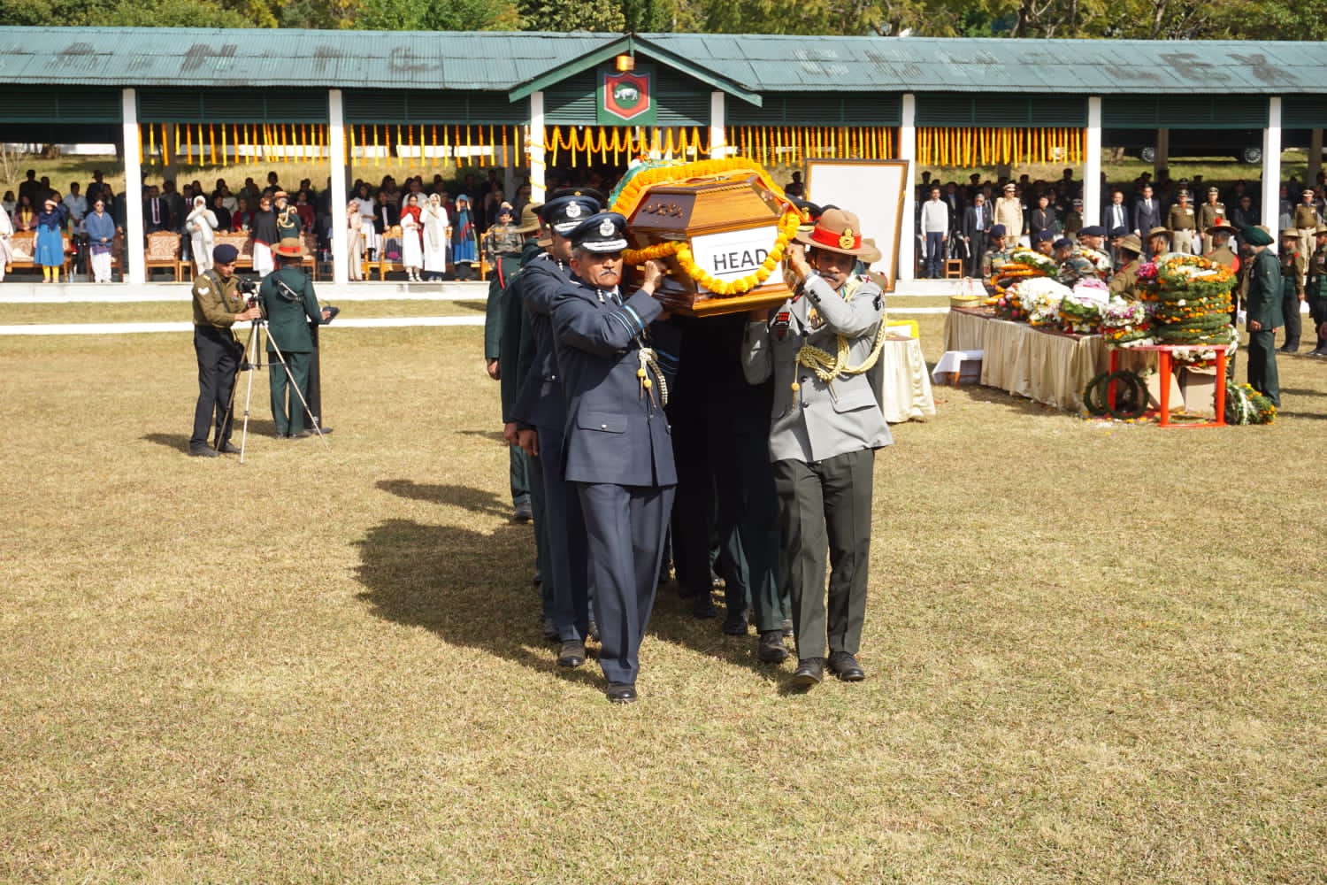 A large gathering of military, Police personnel, CAPF and civil officials paid their last respects to the Late General. State Minister of Public Health Engineering, Shri Renikton Lyngdoh Tongkhar laid the wreath on behalf of the Government of Meghalaya. Minister of Environment & Forest, Shri Chandra Mohan Patowary paid last respects on behalf of the Government of Assam. Wreaths were also laid on behalf of the Chief of the Army Staff and the Chief of the Air Staff.