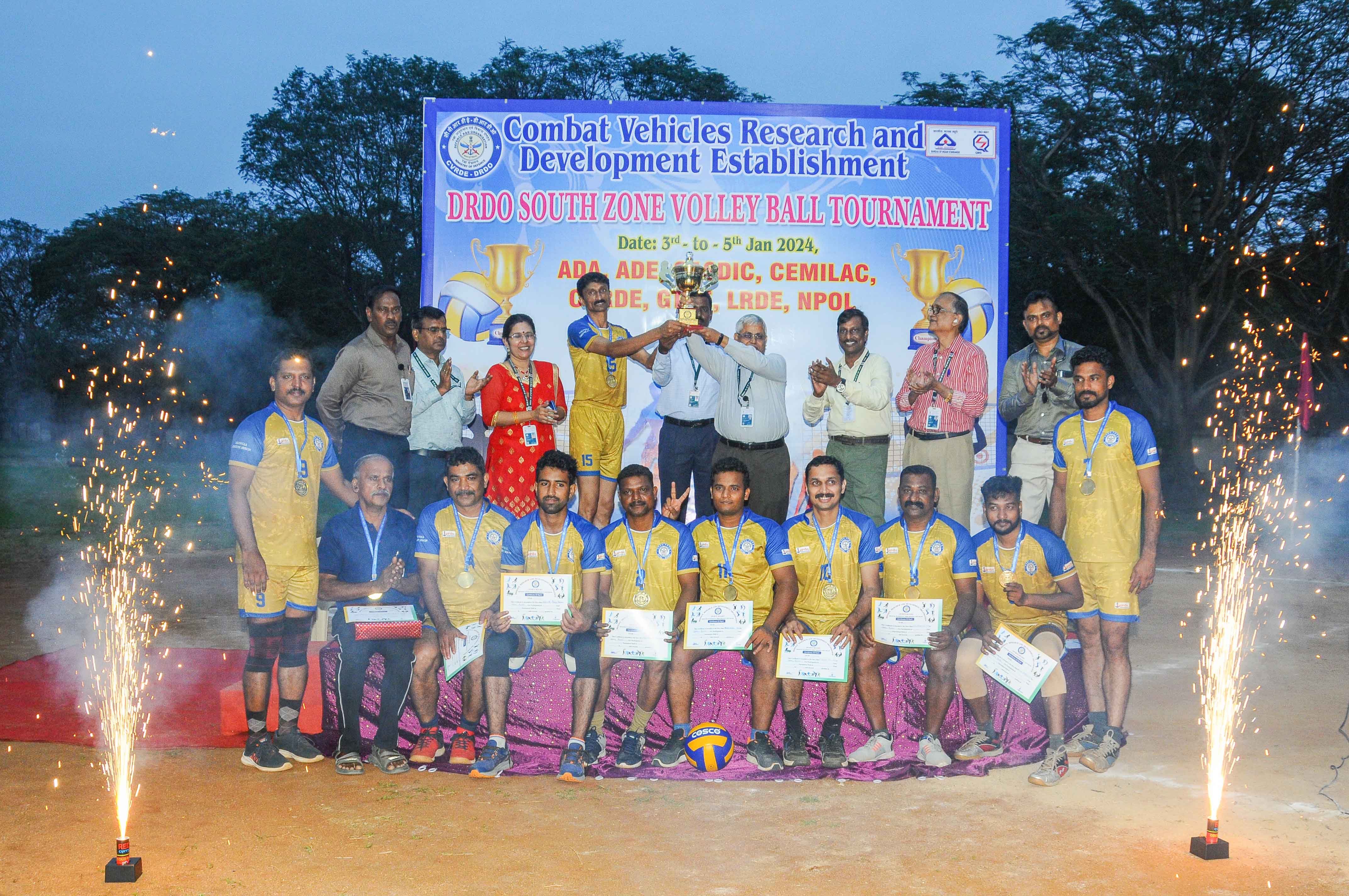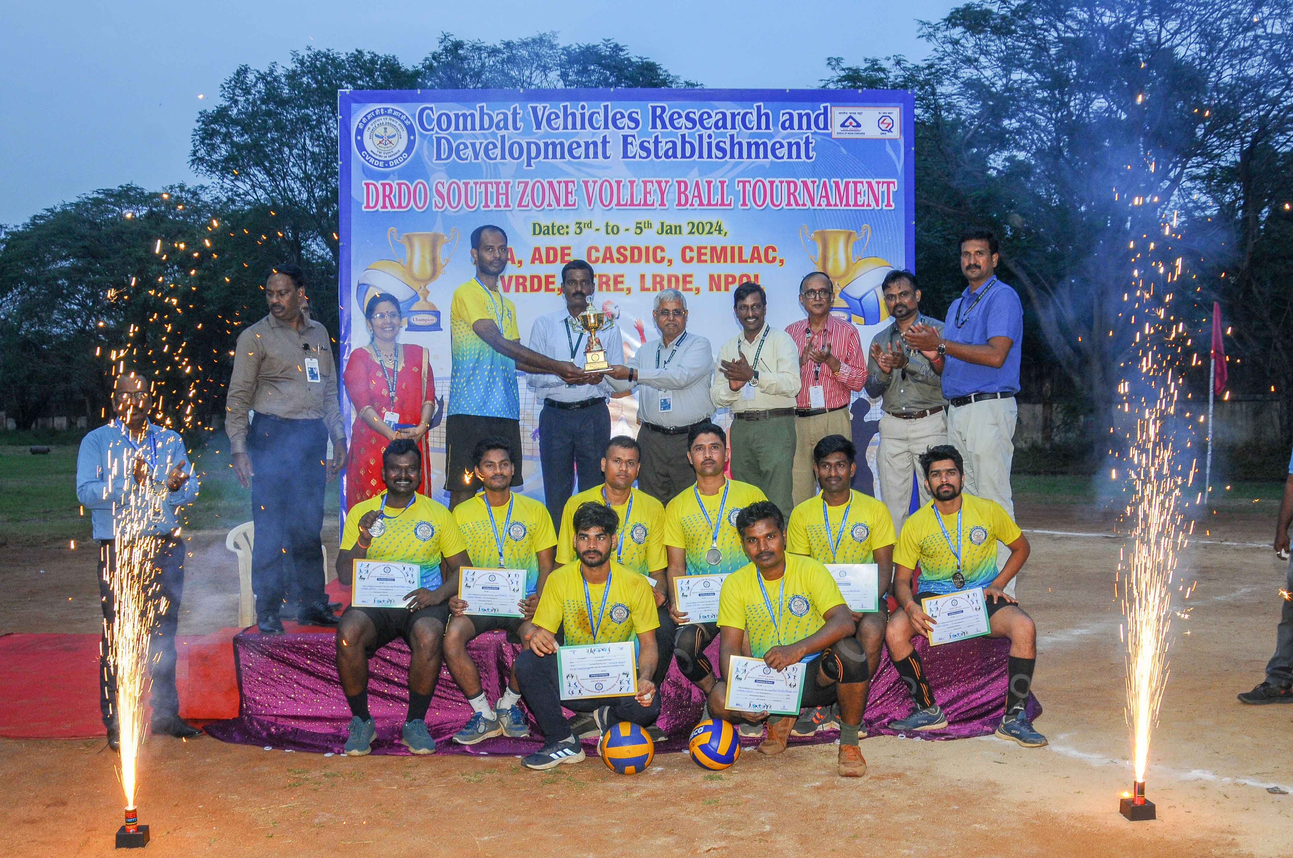 DRDO South zone volley ball tournament for the year 2023-2024 was conducted by CVRDE at Bharadhiyar Nagar Ground (CVRDE Quarters Avadi,Chennai) during 03-05 Jan 2024. Total Eight teams have participated in the volleyball tournament viz., ADE, ADA, CVRDE, CEMILAC, CASDIC, GTRE, LRDE, NPOL and the teams NPOL, Kochi & CVRDE, Chennai have secured the Winners & Runners position respectively.