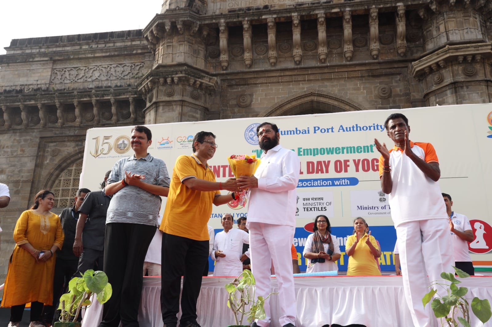 The Governor of Maharashtra Shri Ramesh Bais led the yoga session at Raj Bhawan which was joined by Raj Bhawan, Coast Guard and Press Information Bureau Officers. The yoga session at Raj Bhavan was conducted jointly by 'Kaivalyadhama' yoga institute and the Shrimad Rajchandra Mission Dharampur (SRMD- Yoga). The Chief Minister Shri Eknath Shinde and Deputy CM Shri Devendra Fadnavis led the yoga session at the iconic Gateway of India. More than three thousand citizens participate in the mass yoga demonstration orchestrated by Mumbai Port Trust, India Tourism- Mumbai and Ministry of Textiles, in association with Patanjali Yogpith. Yuva Tourism Clubs participated in large numbers. Union Commerce and Industry Minister Shri Piyush Goyal participated in a yoga session at Poinsur Gymkhana in Kandivali West.