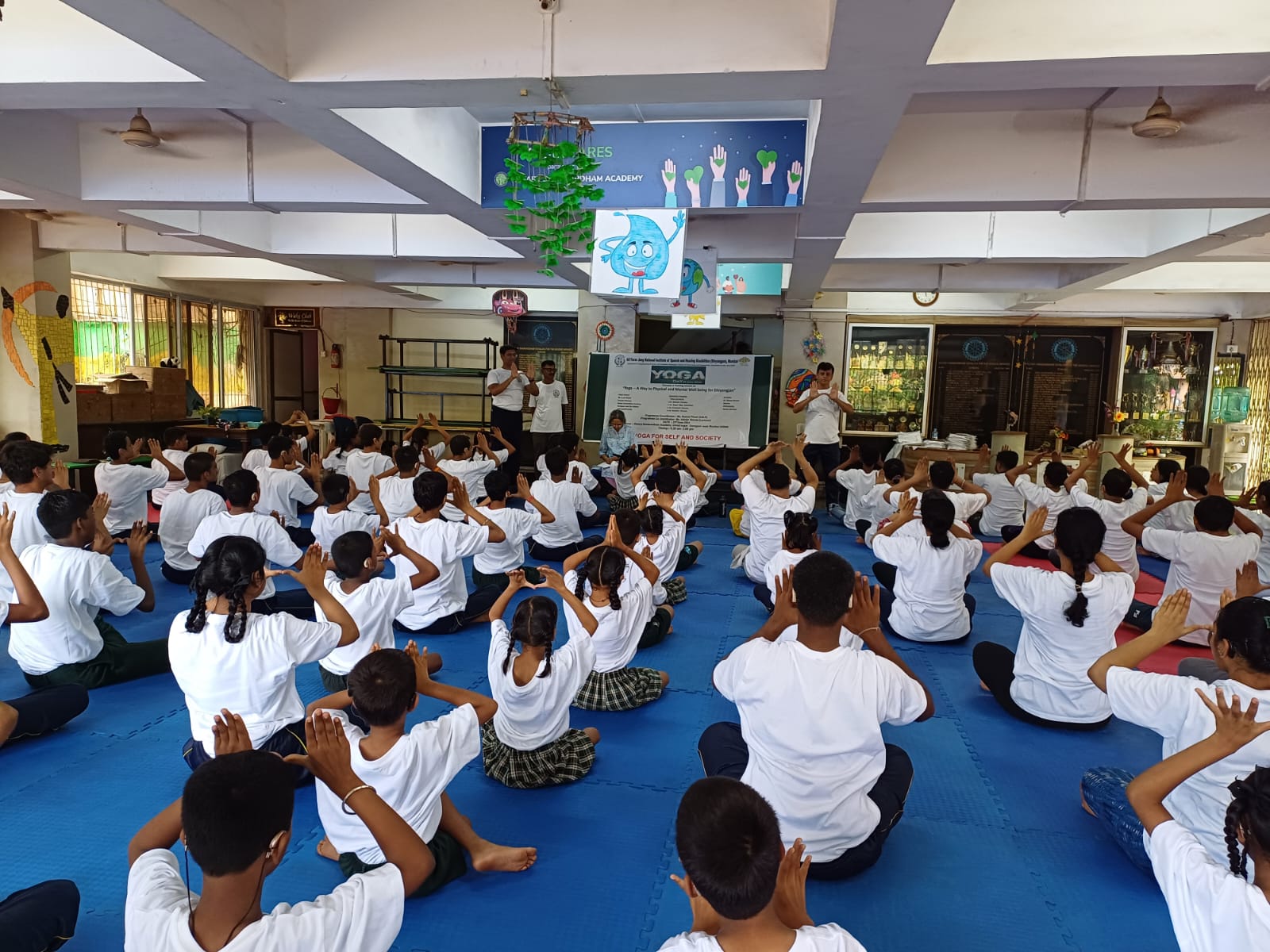 Ali Yavar Jung National Institute of Speech and Hearing Disabilities (Divyangjan), Mumbai [AYINISHD(D)), an autonomous national institute under the Department of Empowerment of Persons with Disabilities (DEPWD), Ministry of Social Justice and Empowerment (MSJ&E), celebrated International Yoga Day on the theme "Yoga for Self and Society' with great enthusiasm and participation. These sessions focused on the multifaceted benefits of yoga, encompassing physical, mental, emotional, and spiritual well-being. Participants, especially the children with special needs, received personalized guidance from the experts. The yoga exercises and routines demonstrated were tailored to enhance their daily health practices, aiming to significantly improve their overall quality of life.