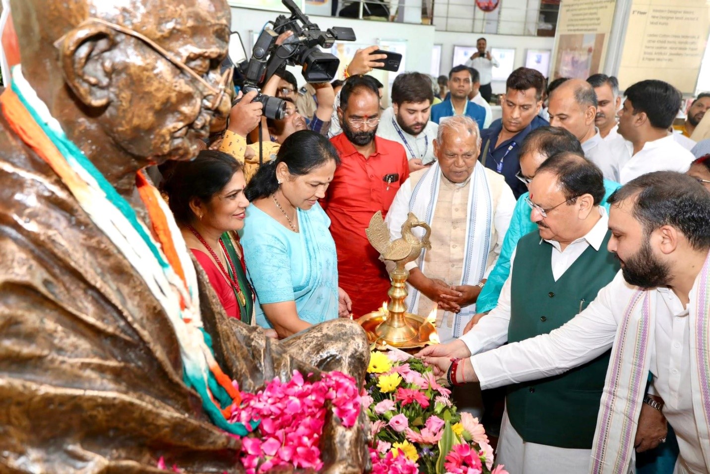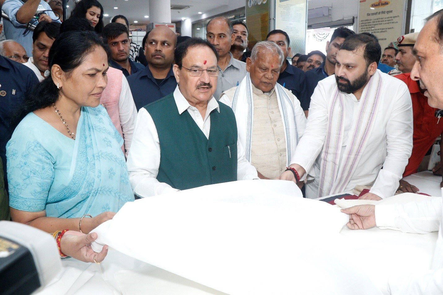 To commemorate Mahatma Gandhi’s birth anniversary, Union Health and Family Welfare and Chemicals and Fertilizers Minister Shri J.P. Nadda, and Union MSME Minister Shri Jitan Ram Manjhi, Minister of State for MSME and Labour & Employment Sushri Shobha Karandlaje, along with KVIC Chairman Shri Manoj Kumar and several other dignitaries, shopped at the Khadi Bhavan on Baba Kharak Singh Marg, officially launching the special discount campaign. Shri J.P. Nadda purchased fabric for a Khadi kurta and Village Industries products, making the payment online. Addressing the media, Shri Nadda appealed to citizens to buy Khadi products.