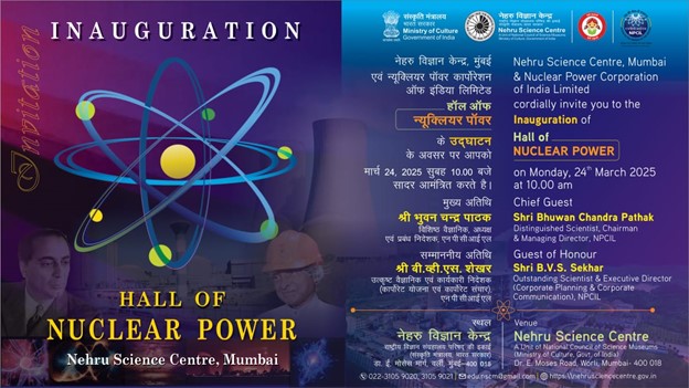 The Hall of Nuclear Power at Nehru Science Centre, Mumbai, is set to be inaugurated on 24th March 2025 at Nehru Science Centre, Mumbai. Bhuwan Chandra Pathak, Chairman & Managing Director of the Nuclear Power Corporation of India Limited (NPCIL) will be inaugurating the hall.