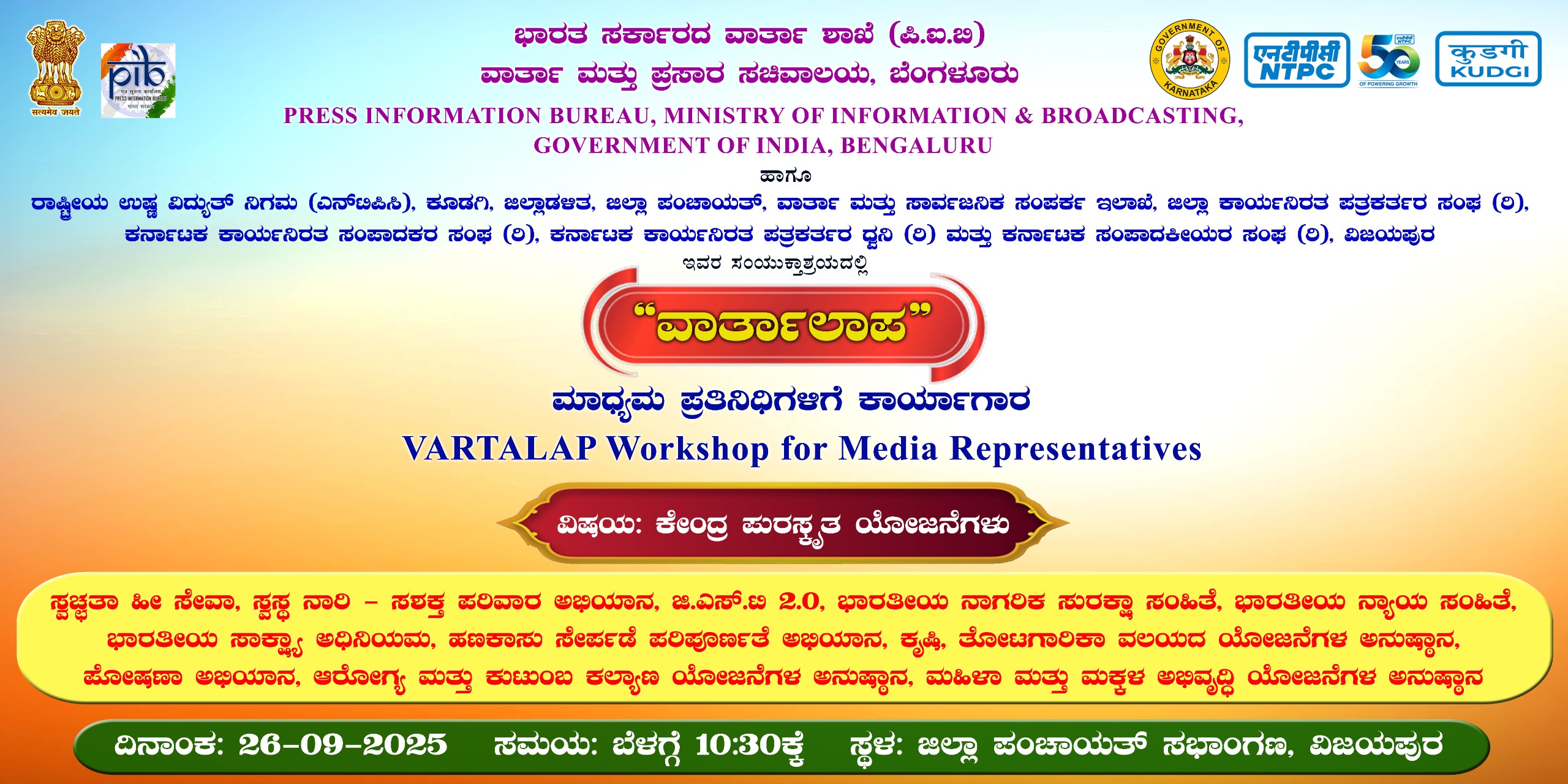 In a collaborative effort, the Press Information Bureau (PIB), Bengaluru, National Thermal Power Corporation (NTPC) Kudgi, District Administration of Vijayapura, Zilla Panchayat of Vijayapura, Department of Information and Public Relations, District Working Journalists' Association (Regd.), Karnataka Working Editors' Association (Regd.), Karnataka Working Journalists' Voice (Regd.), and Karnataka State Women Editors' Association (Regd.), Vijayapura, are organising a "Vartalap" workshop on centrally sponsored schemes for media representatives. The event will take place on Friday, 26th September, at the Zilla Panchayat Auditorium in Vijayapura.