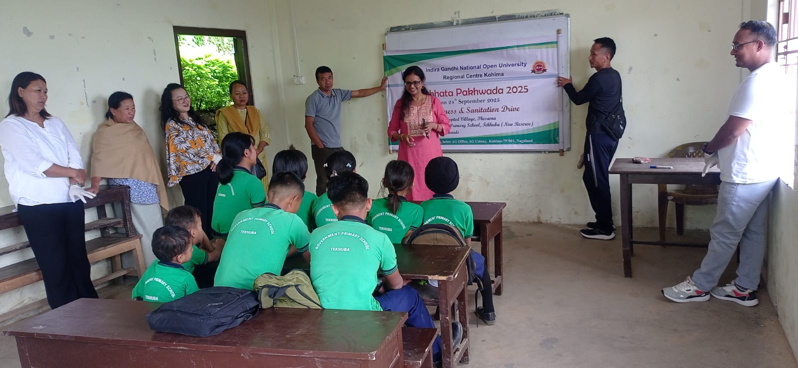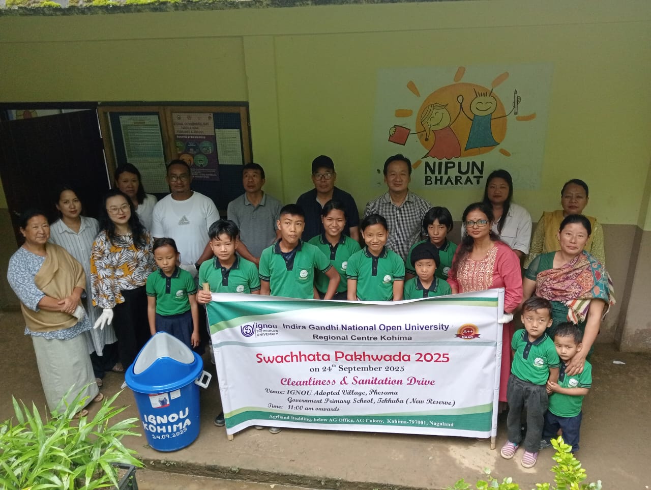 IGNOU Regional Centre Kohima, Nagaland organised Swachcha Hi Seva campaign 2025 and Swachcha Pakhwada activities from 16th September 2025. From cleaning the Regional Centre at Kohima and its neighborhood to conducting a cleanliness and sanitation drive at its adopted village Phesama on 24.09.2025 the Regional Centre has actively participated in highlighting the significance of Swachhata mission and spreading awareness in the society. The officials from the Regional centre along with the staff and students of Government Primary School, Tekhuba (New Reserve), Phesama, took active participation in the cleanliness drive held on 24th September 2025. As a part of campaign activity, the centre also distributed Dustbin and brooms to the school and emphasized upon sanitation, health and hygiene.