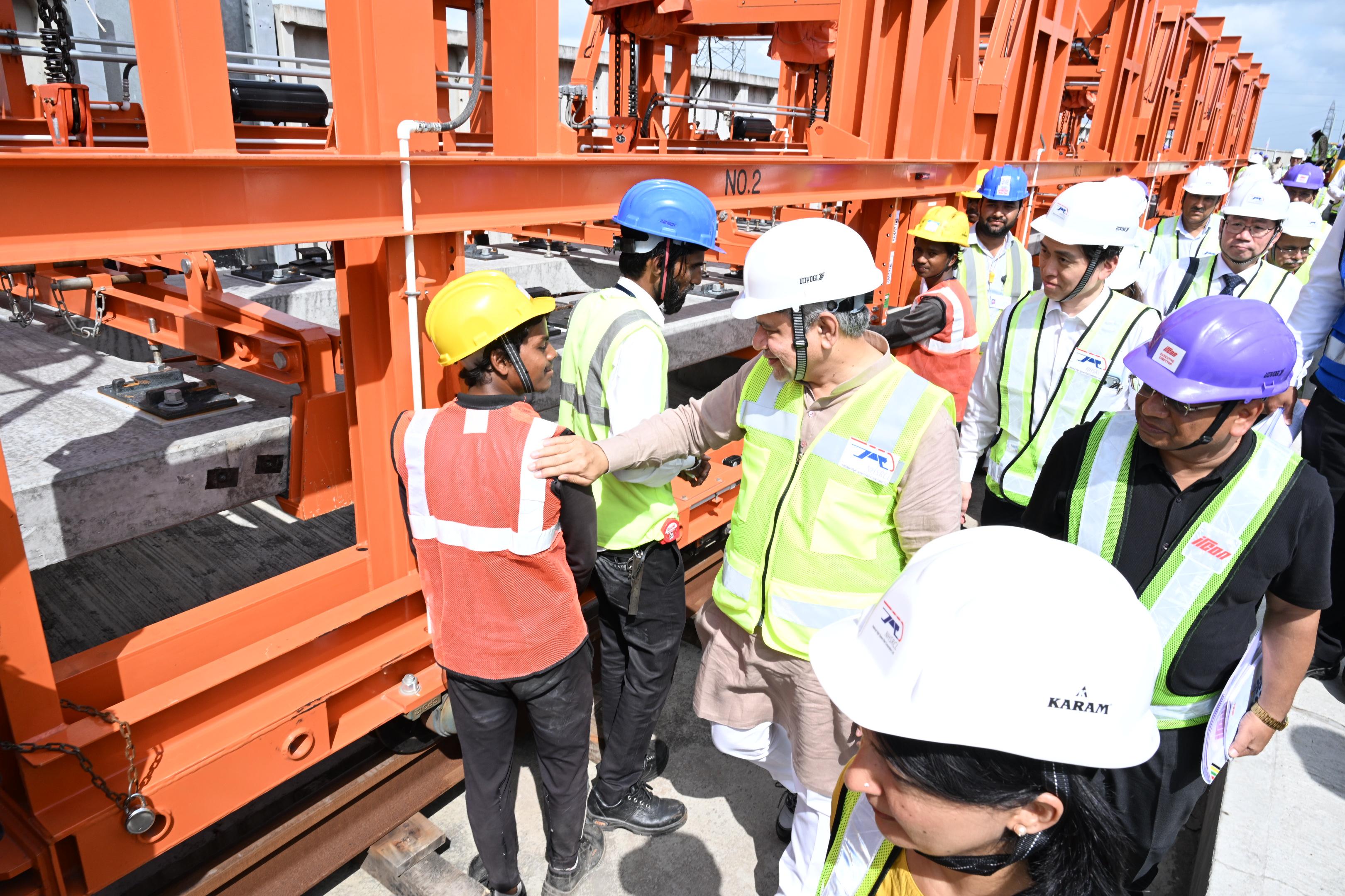 Hon’ble Ministers reviewed key components of the project, including the track slab laying car and the track slab adjustment facility.