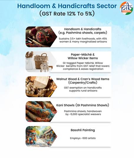 In the Kashmir Valley, especially Kanihama, nearly 5,000 weavers craft fine GI-tagged Pashmina shawls. The GST cut from 12% to 5% makes these shawls more affordable, boosting demand, exports, and competitiveness against machine-made imitations, while securing livelihoods and preserving Kashmir’s iconic heritage.