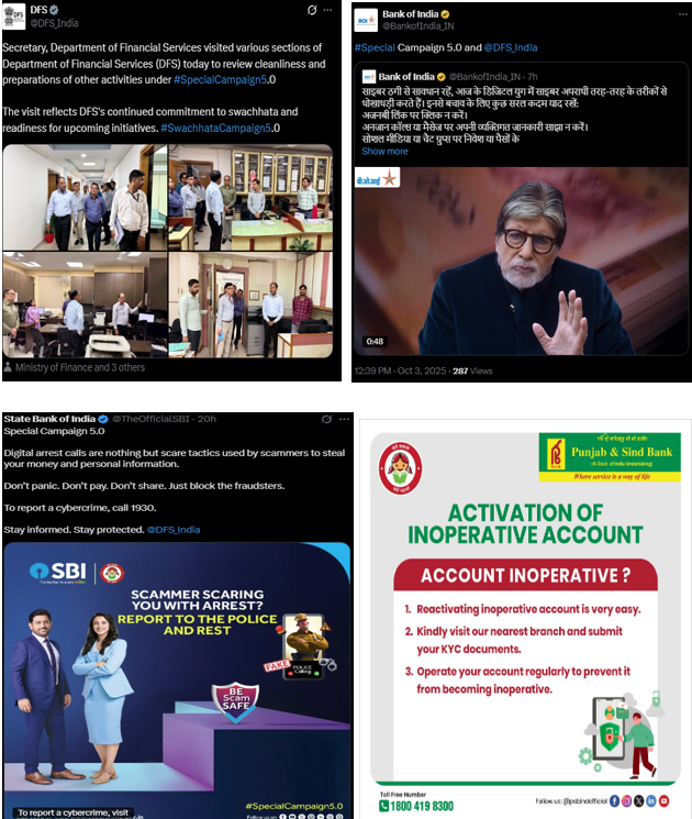 The Department would also focus on specific activities that are relevant to financial service sector viz. updating dormant accounts, renewal of locker agreements, claim settlements, pension grievances redressal and updating nomination in accounts. Also, awareness programmes on prevention from Cyber Crime and Digital arrest will be conducted during the campaign.
