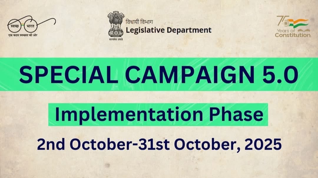 Legislative Department, Ministry of Law and Justice, Shastri Bhawan is observing Special Campaign for Disposal of Pending Matters (SCDPM). The Special Campaign 5.0 starts from 2nd October, 2025 to 31st October, 2025. This year, the campaign will focus on the disposal of e-waste such as unserviceable or discarded computers, laptops, printers, LEDs, e-display boards, etc., as well as liquidating pendency in the MPs References, References from the State Governments, Inter-Ministerial References, Parliamentary Assurances, PMO references, Public Grievances and PG Appeals, etc. The campaign also places emphasis on record management, review and weeding out of physical records and ensuring overall cleanliness of government offices, digitization of records/files with a special focus on space management and enhancing the workplace experience in field offices. As part of the Special Campaign 5.0. The Legislative Department is committed itself ensuring the objectives of the Special Campaign 5.0 are effectively met by taking up targeted activities by reducing pendency, disposing of redundant materials, and improving record management systems.