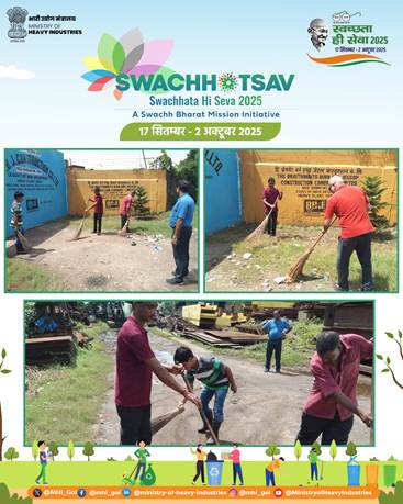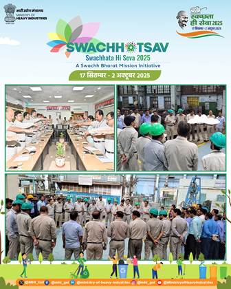 The Ministry of Heavy Industries (MHI) actively participated in the nationwide Swachhata Hi Seva – 2025 campaign, organized from 17th September to 2nd October 2025 under the joint aegis of the Department of Drinking Water and Sanitation (DDWS) and the Ministry of Housing and Urban Affairs (MoHUA).