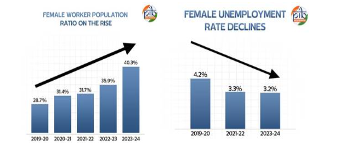 15 വയസ്സും അതിൽ കൂടുതലുമുള്ള വനിതകളുടെ WPR 2017-18 ലെ 22% ൽ നിന്ന് 2023-24 ൽ 40.3% ആയി ഉയർന്നു, LFPR 23.3% ൽ നിന്ന് 41.7% ആയി ഉയർന്നു.