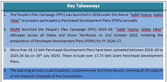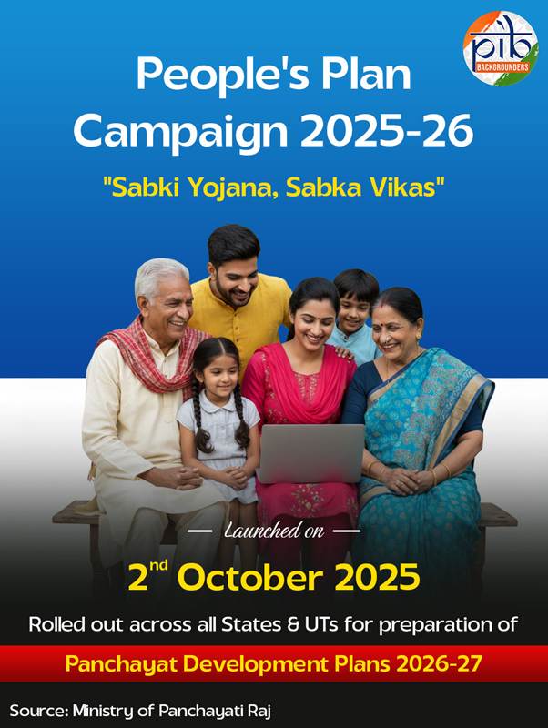 The Ministry of Panchayati Raj launched the People’s Plan Campaign (PPC) 2025–26: “Sabki Yojana, Sabka Vikas” Abhiyaan on 2nd October 2025 across all States and Union Territories, thereby initiating the nationwide process for preparing Panchayat Development Plans (PDPs) for the Financial Year 2026–27.