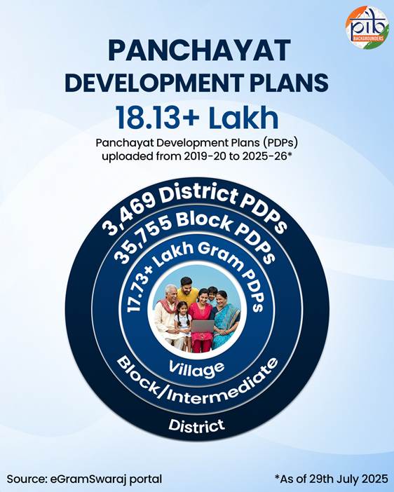As per data available on the eGramSwaraj Portal, more than 18.13 lakh Panchayat Development Plans have been uploaded from 2019–20 to 2025-26 (as on 29th July 2025). These include: