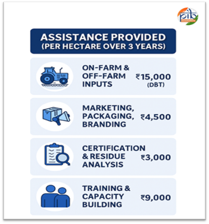 ଜାତୀୟ ଜୈବିକ କୃଷି ମିଶନ (ଏନଏମଓଏଫ) ଅଧୀନରେ, ଜୈବିକ କୃଷି ପଦ୍ଧତି ଗ୍ରହଣ କରୁଥିବା ଚାଷୀମାନଙ୍କୁ ତିନି ବର୍ଷ ପାଇଁ ପ୍ରତି ହେକ୍ଟର ପାଇଁ ୩୧,୫୦୦ ଟଙ୍କାର ସହାୟତା ପ୍ରଦାନ କରାଯାଏ। ଏହି ସହାୟତା ନିମ୍ନଲିଖିତ ଭାବରେ ଦିଆଯାଏ: