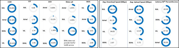 Call Setup Success Rate: Airtel, BSNL, RJIL and VIL have call setup success rate of 99.36%, 87.26%, 99.89% and 85.62% respectively in Auto-selection mode (5G/4G/3G/2G).