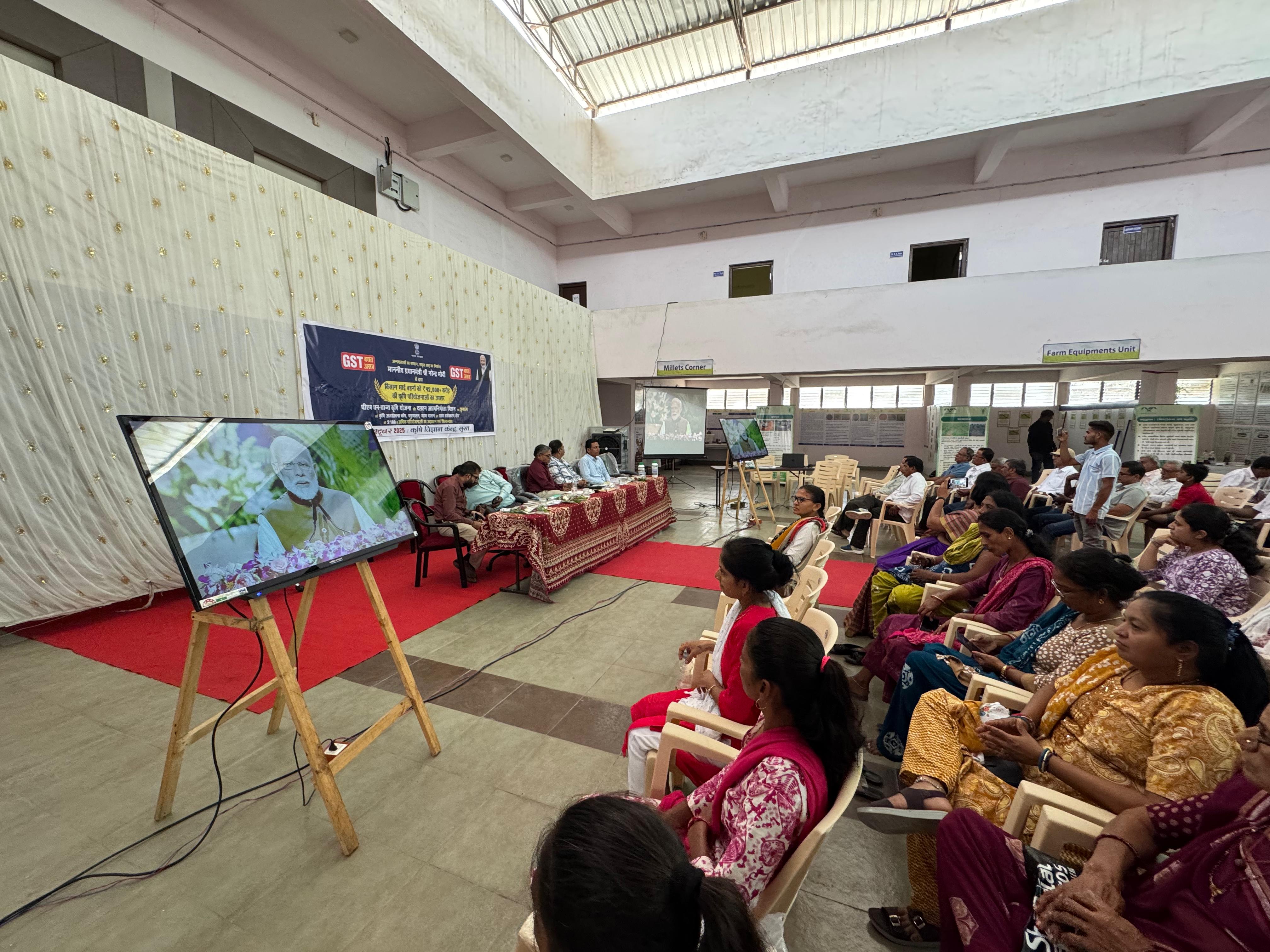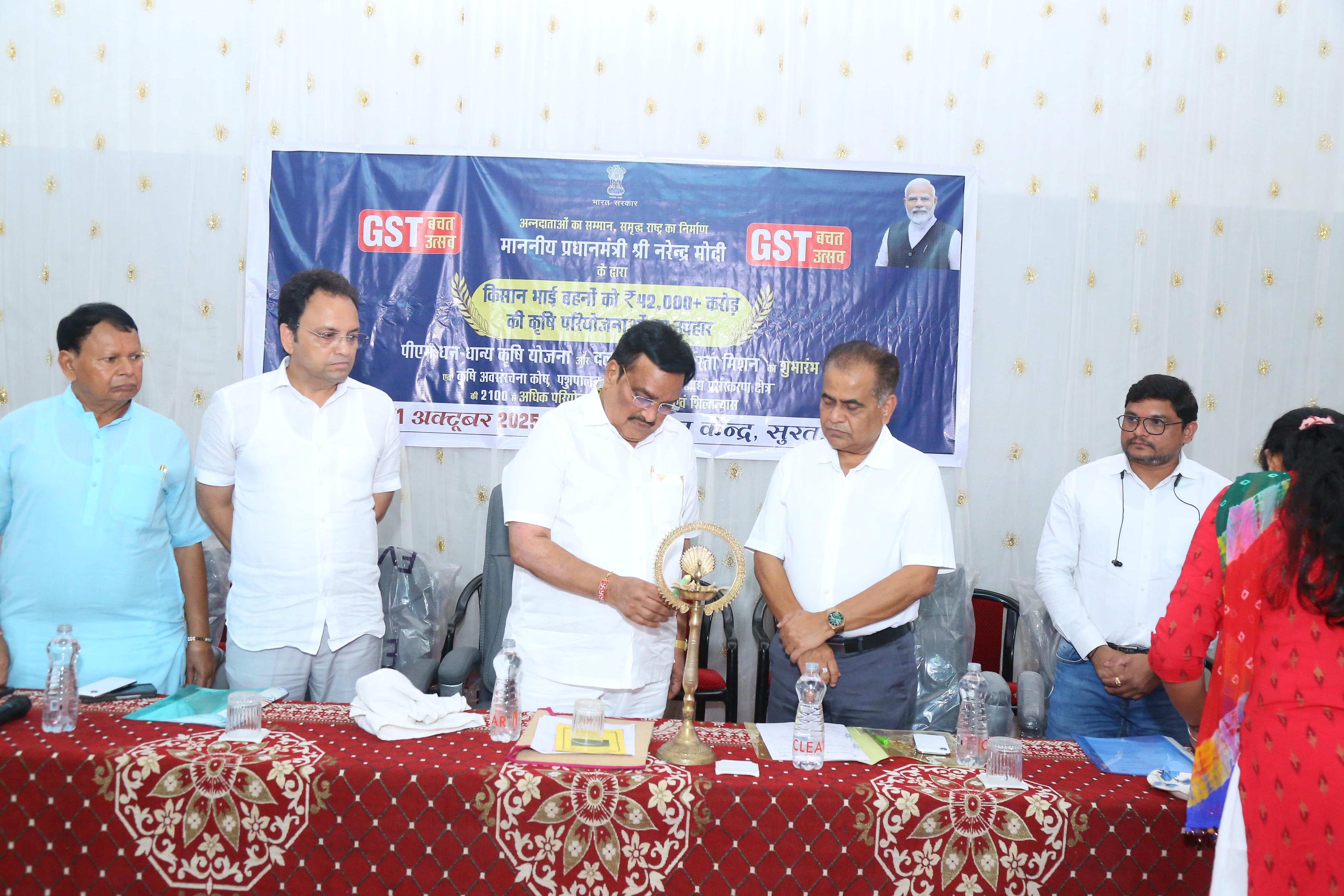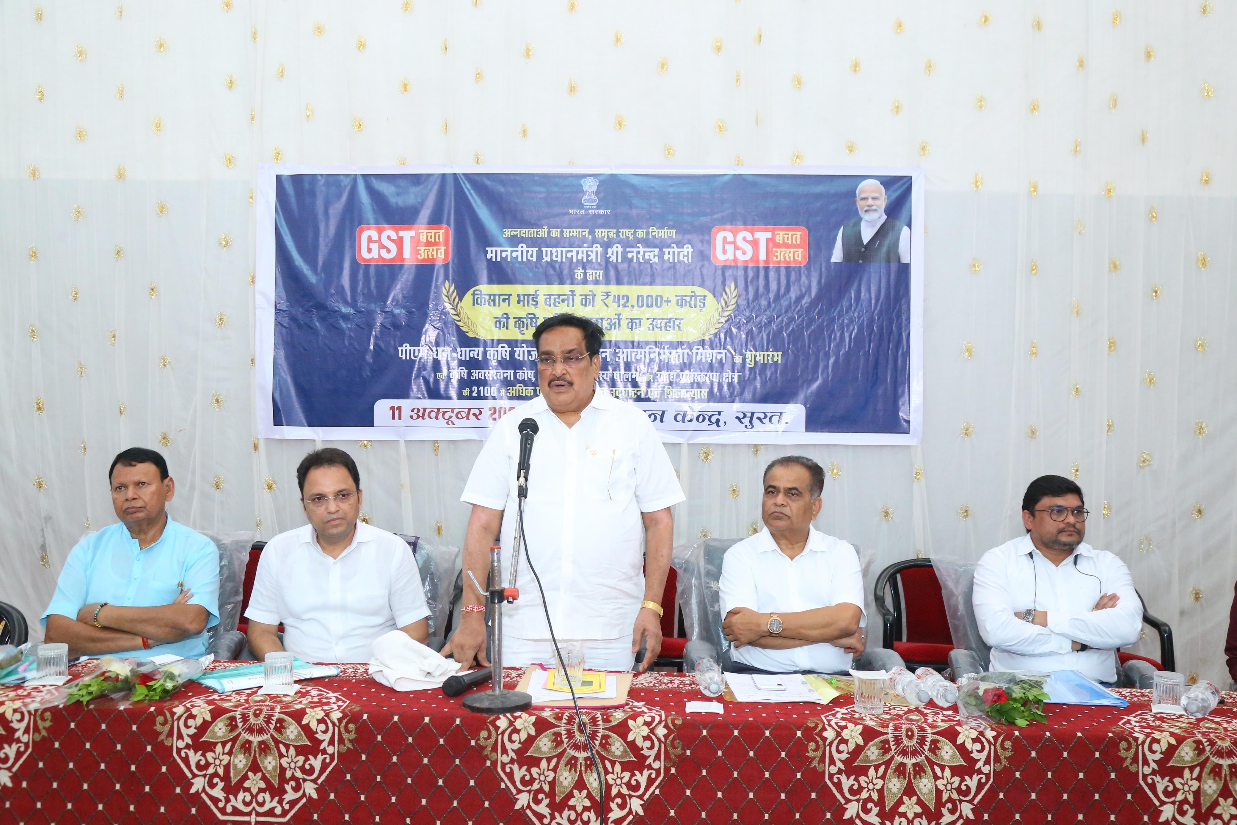 'GST બચત ઉત્સવ'ના અવસરે પ્રધાનમંત્રીશ્રી નરેન્દ્ર મોદીના હસ્તે રૂ.42 હજાર કરોડથી વધુની ખેડૂતલક્ષી 'પીએમ ધન ધાન્ય કૃષિ યોજના' અને કઠોળ આત્મનિર્ભરતા મિશનનો દિલ્હીથી વર્ચ્યુઅલી ઉદ્ઘાટન અને શિલાન્યાસ કરવામાં આવ્યું હતું. આ પ્રસંગે વેસુ સ્થિત ક્રૃષિ વિજ્ઞાન કેન્દ્ર ખાતે કેન્દ્રીય જળશક્તિમંત્રી સી.આર. પાટીલ ઉપસ્થિત રહ્યા હતા.