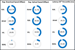 Latency (Overall): Airtel, BSNL, RJIL and VIL 50th percentile latency is 20.25 ms, 33.30 ms, 18.50 ms and 28.95 ms respectively.
