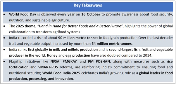 ഭക്ഷ്യ സംസ്കരണം, സുസ്ഥിരത, നൂതനാശയങ്ങള് എന്നിവയിലെ രാജ്യത്തിൻ്റെ ശക്തി പ്രദർശിപ്പിച്ചും അന്താരാഷ്ട്ര പങ്കാളിത്തം വളർത്തിയും ഇന്ത്യയെ ‘ആഗോള ഭക്ഷ്യ കേന്ദ്ര’മായി അടയാളപ്പെടുത്താന് ലക്ഷ്യമിട്ട സുപ്രധാന പരിപാടിയായിരുന്നു 2025 സെപ്റ്റംബറിൽ ഭക്ഷ്യ സംസ്കരണ വ്യവസായ മന്ത്രാലയം സംഘടിപ്പിച്ച വേള്ഡ് ഫുഡ് ഇന്ത്യ-2025. 90-ലേറെ രാജ്യങ്ങളിലെ പ്രതിനിധികളും 2,000-ത്തിലധികം പ്രദർശകരും പങ്കെടുത്ത പരിപാടി സഹകരണ ശ്രമങ്ങളിലൂടെയും സാങ്കേതിക മുന്നേറ്റങ്ങളിലൂടെയും ആഗോള ഭക്ഷ്യസുരക്ഷ മെച്ചപ്പെടുത്തുന്നതില് ഇന്ത്യയുടെ പങ്കിനെ അടിവരയിട്ടു.