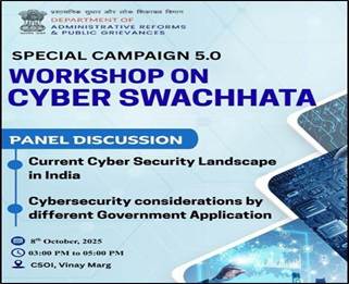A Workshop on Cyber Swachhata was organised by the Department of Administrative Reforms and Public Grievances (DARPG) at CSOI, New Delhi, on 8 October 2025, to enhance cyber awareness and promote the initiatives of the Ministry of Electronics and Information Technology (MeitY) during the ongoing campaign.