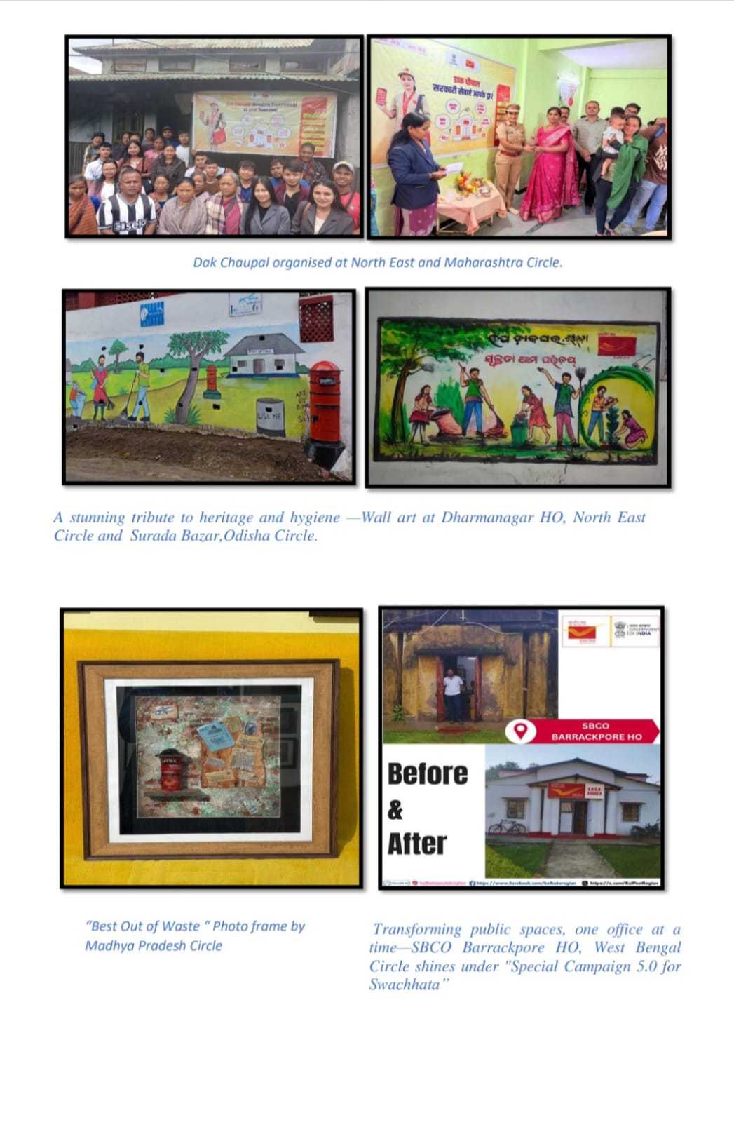As part of the beautification drive, Post Offices across the country have adorned their premises with vibrant Wall Art depicting themes of cleanliness, postal heritage, and public awareness. These creative displays have not only enhanced the aesthetic appeal of office spaces but also served as effective tools to spread the message of Swachhata among citizens and staff alike.
