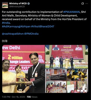For outstanding contribution to implementation of Pradhan Mantri Janjati Adivasi Nyaya Maha Abhiyan (PMJANMAN), Shri Anil Malik, Secretary, Ministry of Women & Child Development, received an award on behalf of the Ministry from the Hon’ble President of India.