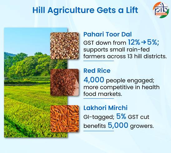 - Hill produce boost as GST cut to 5% on Pahari Toor Dal, Red Rice, and Lakhori Mirchi supports small farmers across 13 hill districts.