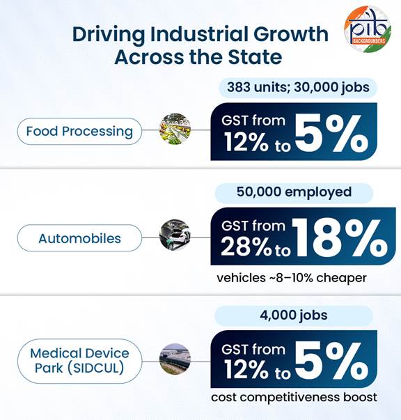 - Auto boost with GST down from 28% to 18%, making vehicles 8–10% cheaper and supporting 50,000 jobs.