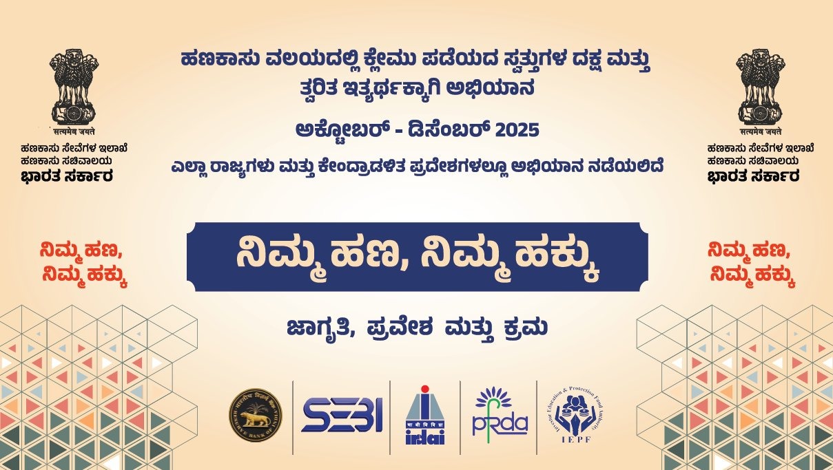 ಭಾರತ ಸರ್ಕಾರದ ಹಣಕಾಸು ಇಲಾಖೆಯಿಂದ ಹಣಕಾಸು ವಲಯದಲ್ಲಿ ಕ್ಲೇಮು ಪಡೆಯದ ಸ್ವತ್ತುಗಳ ದಕ್ಷ ಮತ್ತು ತ್ವರಿತ ಇತ್ಯರ್ಥಕ್ಕಾಗಿ “ನಿಮ್ಮ ಹಣ ನಿಮ್ಮ ಹಕ್ಕು” ಅಭಿಯಾನ ಆಯೋಜಿಸಲಾಗಿದೆ. ಈ ಅಭಿಯಾನವು ಅಕ್ಟೋಬರ್-ಡಿಸೆಂಬರ್ 2025ರ ವರೆಗೆ ಎಲ್ಲಾ ರಾಜ್ಯಗಳು ಮತ್ತು ಕೇಂದ್ರಾಡಳಿತ ಪ್ರದೇಶಗಳಲ್ಲಿ ಅಭಿಯಾನ ನಡೆಯಲಿದೆ. ಅಭಿಯಾನದ ಭಾಗವಾಗಿ ಕ್ಲೇಮು ಪಡೆಯದ ಸ್ವತ್ತುಗಳ ಕುರಿತು ಜಾಗೃತಿ ಹಾಗೂ ಇತ್ಯರ್ಥಕ್ಕಾಗಿ ಕ್ರಮ ಕೈಗೊಳ್ಳಲಾಗುತ್ತದೆ.