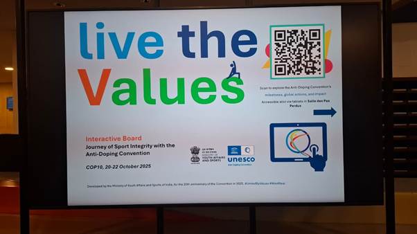 India also extended in-kind support to the proceedings of the COP10 Session by facilitating provision of Interactive Boards displaying the journey of the Anti-Doping Convention.