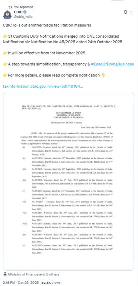નવું નોટિફિકેશન નં. 45/2025-કસ્ટમ્સ તારીખ 24.10.2025, 1 નવેમ્બર 2025 થી અમલમાં આવશે, જે 31 કસ્ટમ્સ નોટિફિકેશનમાં ઉપલબ્ધ તમામ હાલના લાભો અને ડ્યુટી મુક્તિઓ જાળવી રાખે છે, જેમાં EXIM ટ્રેડ સમાન અવિરત વિશેષાધિકારોનો આનંદ માણી રહ્યું છે, જેમાં બે નાના ફેરફારોનો સમાવેશ થાય છે: