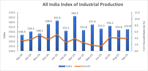 Driven by 4.8% growth in manufacturing sector, Index of Industrial Production (IIP) recorded a 4.0 % year-on-year growth in September 2025.