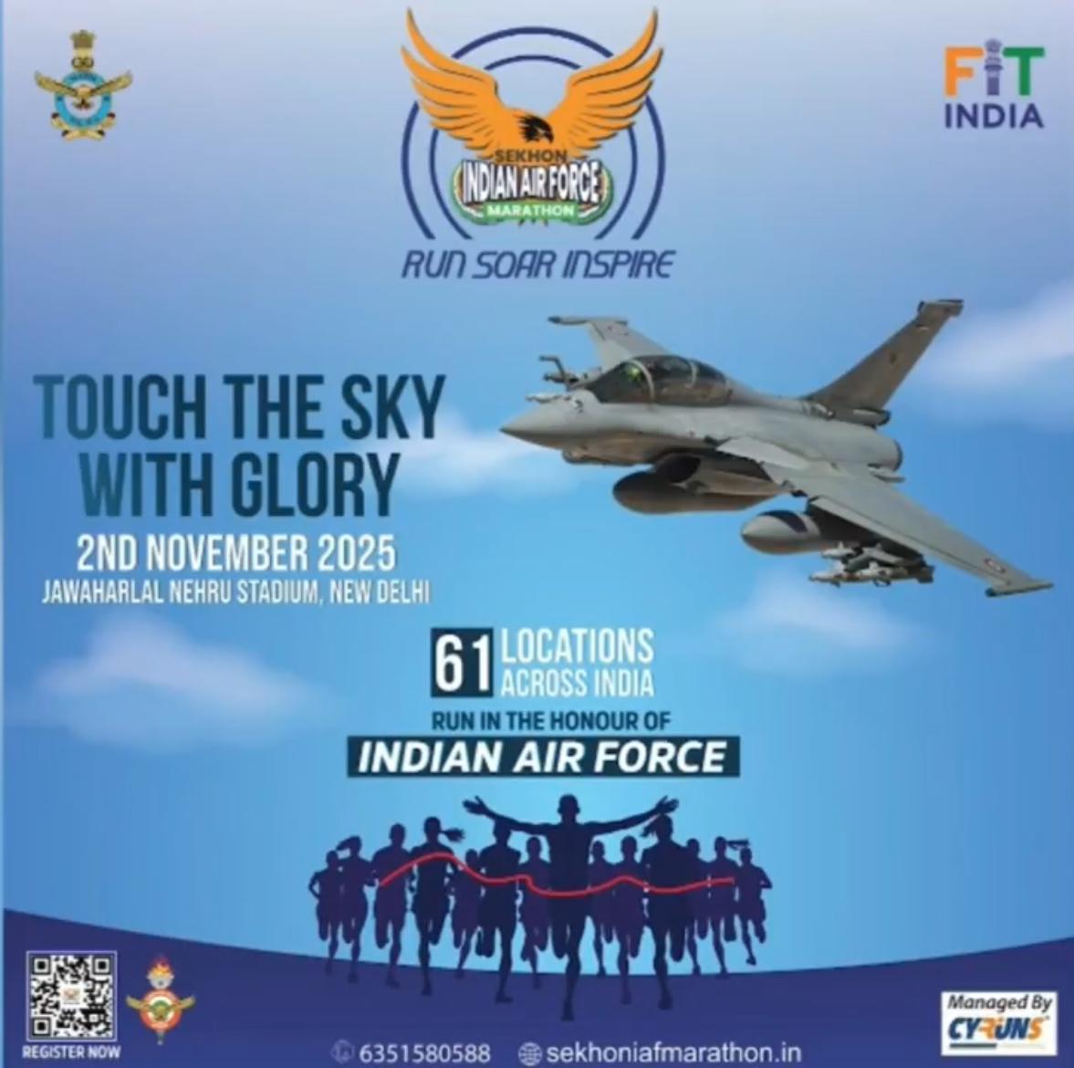 On 2nd November 2025, IAF is set to host the Sekhon IAF Marathon 2025 (SIM-25) a half marathon, 10 KM and 5 KM runs that aim to unite fitness, patriotism, and national pride under one banner. The main event will be flagged off from Jawaharlal Nehru Stadium, New Delhi. It will be simultaneously conducted at 60 Air Force stations across the country. The marathon stands as a befitting tribute to Flying Officer Nirmal Jit Singh Sekhon, the IAF officer who fought against all odds in 1971 Indo-Pak war and was awarded the Param Vir Chakra, the nation's highest gallantry award.