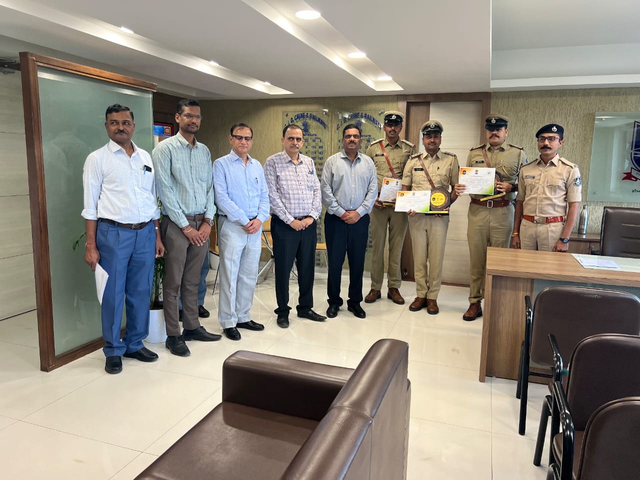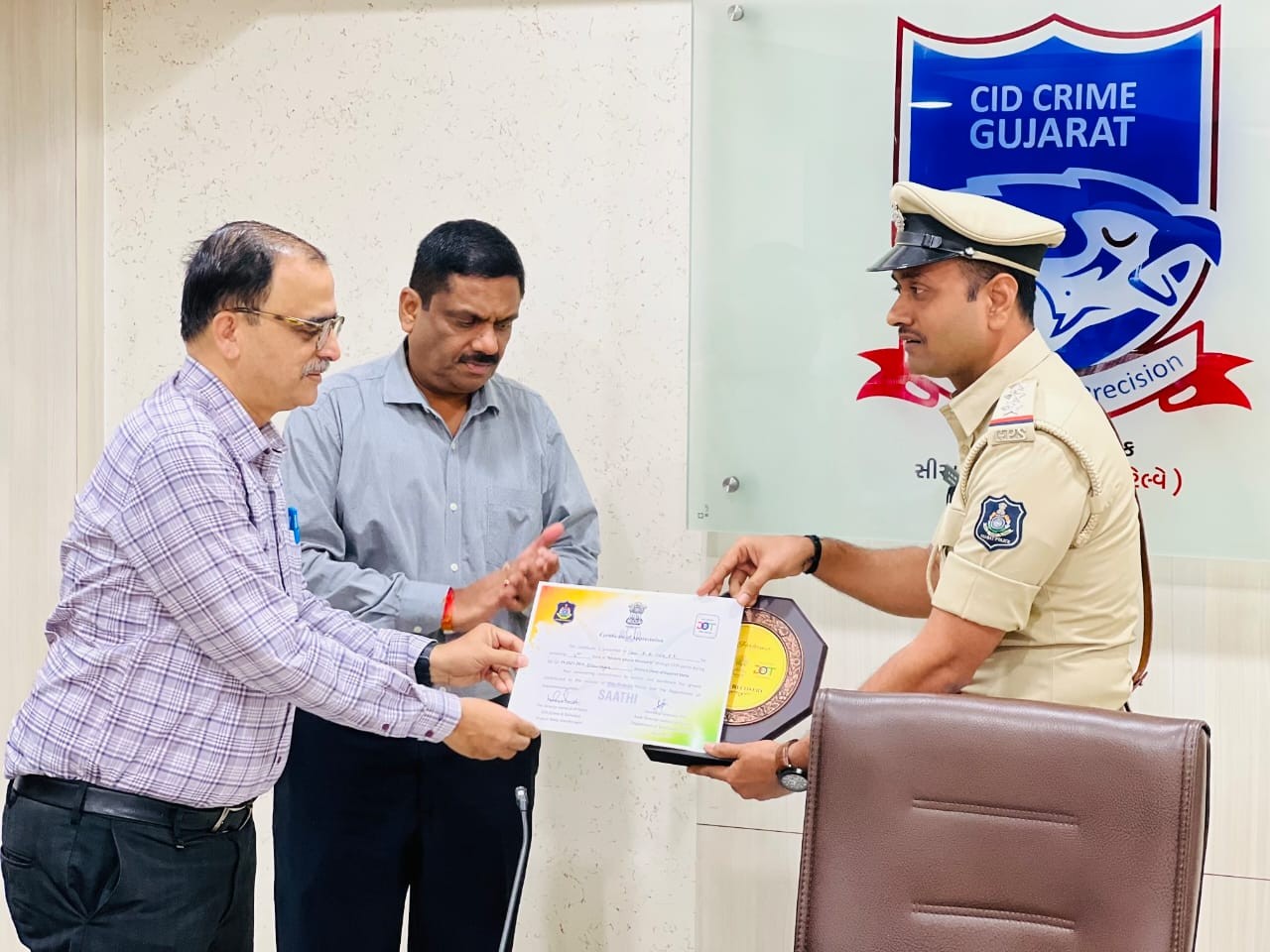 29.10.2025ના રોજ એક ઔપચારિક સમારોહ દરમિયાન શ્રી સંદીપ સાવરકર, એડિશનલ ડીજીટી, ગુજરાત એલએસએ અને શ્રી કે.એલ.એન.રાવ, ડીજીપી, સીઆઈડી (ક્રાઈમ અને રેલ્વે) દ્વારા શિલ્ડ અને પ્રમાણપત્રો એનાયત કરવામાં આવ્યા હતા.