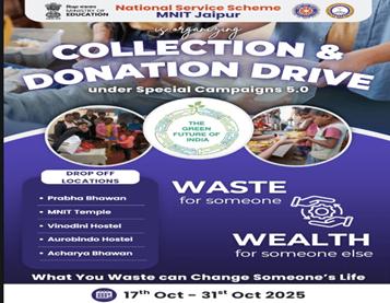 - Collection & Donation Drive: Waste to Wealth- MNIT, Jaipur under the Special Campaign 5.0 ("Waste to Wealth"). Collecting items like clothing, old textbooks, stationery, household items, and bags from students, faculty, and staff that are no longer needed by them and transforming these wastes into someone's wealth by donating them. These items provide direct relief and hope to those facing hardship.