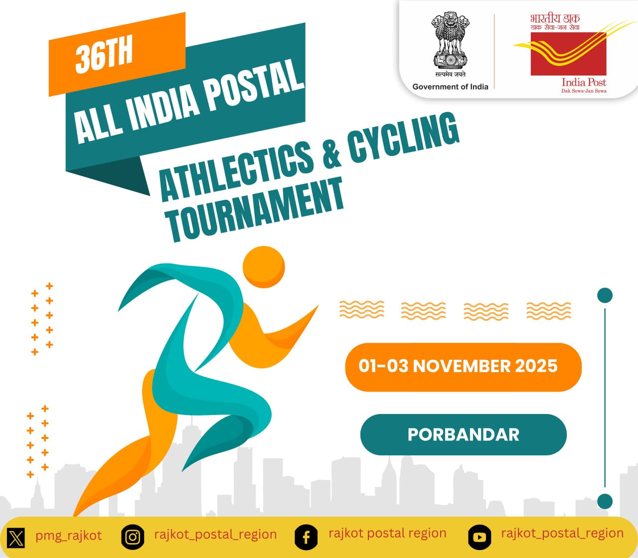 પોસ્ટ માસ્ટર જનરલ, રાજકોટ તથા ગુજરાત પોસ્ટલ સર્કલ સ્પોર્ટ્સ બોર્ડ, ભારતીય ટપાલ વિભાગના સંયુક્ત ઉપક્રમે, સૌરાષ્ટ્રની પાવન ભૂમિ — સુદામાનગરી અને રાષ્ટ્રપિતા મહાત્મા ગાંધીની જન્મભૂમિ પોરબંદર ખાતે 36મી ઓલ ઇન્ડિયા પોસ્ટલ એથ્લેટિક એન્ડ સાઈકલીંગ ટુર્નામેન્ટ 2025-26નું ભવ્ય આયોજન કરવામાં આવ્યું છે.