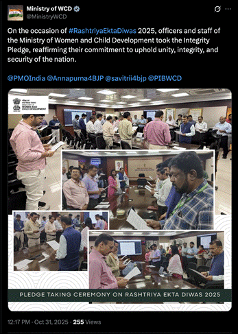On the occasion of Rashtriya Ekta Diwas 2025, officers and staff of the Ministry of Women and Child Development took the Integrity Pledge, reaffirming their commitment to uphold unity, integrity, and security of the nation.