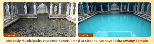 Metpally Municipality in Telangana undertook the rejuvenation of the Koneru at Chenna Keshavanatha Swamy Temple, located near the municipal office in Metpally town, during the Swachhata Hi Seva campaign. The sacred pond was heavily silted and filled with plastic waste and debris, diminishing its aesthetic and spiritual significance. In response, the Municipality launched a targeted cleanliness and restoration drive within the temple premises.
