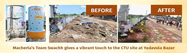 Macherla Municipality undertook a large-scale cleanliness and beautification drive during the Swachhata Hi Seva 2025 campaign. The initiative focused on transforming the CTU site at Yadavula bazar near a water tank that had become a dumping ground for animal waste. Over 1,500 volunteers, including students, youth, Women SHGs, citizens, and sanitation workers, participated in the drive, collecting nearly 150 metric tonnes of garbage which was transported to the Waste-to-Compost Plant at Macherla.