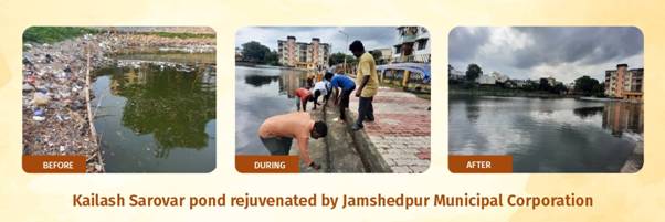 Jamshedpur Municipal Corporation organized a special pond cleaning drive at Kailash Sarovar, located in Ward No. 02, Sonari, with the active participation of local residents. The initiative witnessed enthusiastic involvement from citizens, Self-Help Groups (SHGs), youth volunteers, and Safai Mitras, who came together to restore the beauty and ecological balance of the water body.